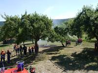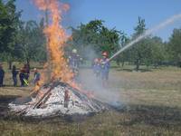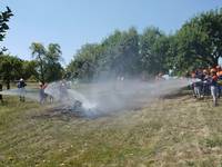 Es folgten Einweisungen in die Grundtätigkeiten eines Löschangriffs und mit Eifer machten sich die Teilnehmer daran das in kürzester Zeit Erlernte bei strahlendem Sonnenschein in die Tat umzusetzen.
