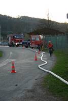 Da vor Ort keine Möglichkeit zur Wasserentnahme aus dem Hydrantennetz besteht, wurde von einem weiteren Löschgruppenfahrzeug eine Wasserversorgung vom nahegelegenen Badesee aufgebaut.