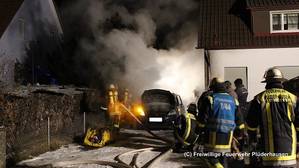 Am vergangenen Sonntag wurde die Freiwillige Feuerwehr Plüderhausen gegen 23:30 Uhr zu einem Fahrzeugbrand in den Lilienweg gerufen. Den ersten Einsatzkräften, die bereits wenige Minuten nach der Alarmierung am Einsatzort waren, bot sich ein PKW im Vollbrand in einer Hofeinfahrt und in unmittelbarer Nähe des Wohngebäudes. Durch das schnelle Eingreifen der Feuerwehr konnte ein Übergreifen des Feuers auf das Wohnhaus und somit weiterer Schaden verhindert werden. Die derzeit frostigen Temperaturen erschwerten die Löscharbeiten und den Einsatz der Feuerwehr.