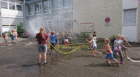 Im Anschluss konnten alle auf dem Hof noch etwas mit dem Feuerwehrschlauch und dem kühlen Nass spritzen. Was den Kindern sehr viel Spaß machte, und somit kaum jemand trocken blieb.