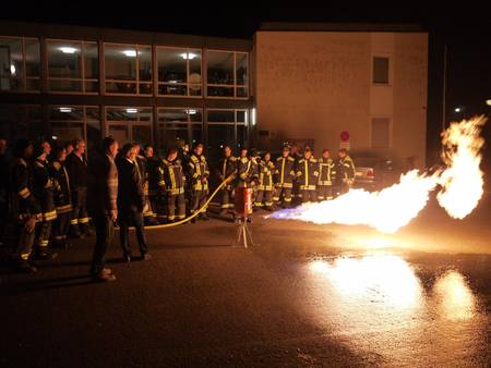 Am Donnerstag, dem 12.03.2015 stand der Übungsband unter dem Motto "Umgang mit Flüssiggas". Hierfür konnten die Herren Roland Hesser und Hans-Peter Brückner von der Firma Tyczka Totalgaz GmbH gewonnen werden. Nach einer kurzen Firmenpräsentation wurde uns in einem Theorieteil allerhand Wissenswertes über Flüssiggas sowie die Vorgehensweise bei Gasbränden oder Gasleckagen erklärt. Weiterhin wurden in diversen Kleinvorführungen die speziellen Eigenschaften von Flüssiggas sehr eindrucksvoll demonstriert. Besonders der sich folgende praktische Teil zeigte deutlich auf, welch enorme Energie bereits in einer handelsüblichen 11 kg-Propangasflasche steckt. Hierzu wurde von den beiden Fachmännern das Gas in der Flüssigphase aus der Flasche entlassen und angezündet, bevor es anschließend von den Kameraden gelöscht werden musste. Insgesamt war dies sicherlich für alle Feuerwehrkameradinnen und -kameraden ein sehr interessanter und aufschlussreicher Übungsabend, mit vielen neuen und hilfreichen Erkenntnissen für Einsätze mit Flüssiggas. An dieser Stelle geht nochmals ein herzlicher Dank an die beiden Referenten sowie an unseren Kameraden Steffen Sinner für die gute Übungsvorbereitung.