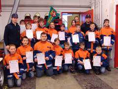 Nach mehreren intensiven Übungsabenden fand am 13. Dezember die Abnahme der Jugendflamme statt. Die Jugendlichen mussten ihre gesammelten Grundkenntnisse in einer schriftlichen und praktischen Prüfung unter Beweis stellen. Nach bestandener Abnahme konnten 20 Mitglieder der Jugendfeuerwehr an der Weihnachtsfeier mit dem bundeseinheitlichen Abzeichen der Jugendflamme Stufe Ia ausgezeichnet werden.