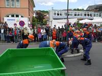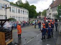 Der Sonntag begann mit dem obligatorischen Frühschoppen und bereits kurz nach 11:00 Uhr waren die besten Plätze auf dem Hof vergriffen. Zur Mittagszeit musste daher, sehr zur Freude aller Kameraden, noch nachbestuhlt werden. Erneut einen Höhepunkt des Festes stellte die Schauübung der Jugendfeuerwehr dar. Auch in diesem Jahr zeigten die Jugendlichen, dieses Mal beim Löschen einer brennenden Gartenhütte ihr ganzes Können - und dies mit Uniformen, Gerätschaften und Fahrzeugen aus den letzten 40 Jahren. Ebenfalls auf großes Interesse stießen wiederum auch die Rundfahrten mit den Feuerwehrfahrzeugen für unsere jüngeren Besucher.
