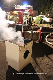 Kurze Zeit später rückten der MTW und das LF 16/12 zur Einsatzstelle ab. Vor Ort wurde in einem Mehrfamilienhaus ein stark verrauchtes Kellergeschoss aufgefunden. Umgehend ließ der Einsatzleiter daher weitere Fahrzeuge an die Einsatzstelle abrücken, während gleichzeitig ein Trupp unter schwerem Atemschutz in die Kellerräume vordrang. Im Waschraum des Kellergeschosses konnte schnell der Brandherd - eine in Brand geratene Waschmaschine - lokalisiert und anschließend abgelöscht werden. Zur Sicherheit wurde diese ins Freie verbracht, bevor dann die vollständige Entrauchung des Geschosses mittels zweier Hochleistungslüfter vorgenommen wurde.