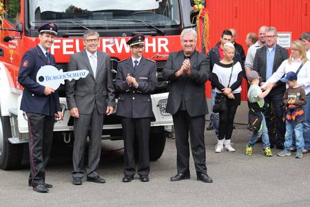 Nach weiteren Grußworten des Kreisbrandmeisters Schmidt und dem Vertreter der Daimler AG, wurde der Schlüssel feierlich an Kommandant Marc Angelmahr übergeben.