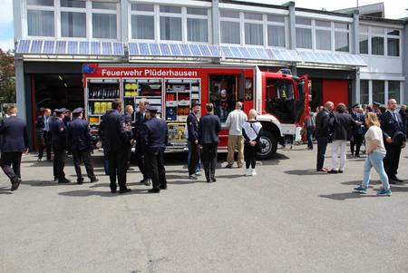 Anschließend folgten die Grußworte des Plüderhäuser Kommandanten Marc Angelmahr, welcher auch auf die technischen Merkmale und die Ausstattung des neuen Fahrzeugs einging. „Das neue Fahrzeug, aufgebaut auf einem Fahrgestell Mercedes Benz Allrad, bereits ausgestattet mit der neuen Abgasnorm EURO 6, einem feuerwehrtechnischem Aufbau der Fa. Lentner und einem zulässigen Gesamtgewicht von 13 Tonnen ist sicherlich bundesweit eines der ersten Fahrzeuge in dieser Form.“ Das Fahrzeug sei dabei mit seinem Löschwassertank von 2.000 Litern an die örtlichen Gegebenheiten angepasst und im übrigen auch für überörtliche Einsätze wie bei Waldbränden oder Brandeinsätzen mit großem Löschwasserbedarf, bestens geeignet. „Mit weiteren auf dem Fahrzeug verlasteten feuerwehrtechnischen Ausrüstungsgegenständen wie: einer auf dem Dach verlasteten Schleifkorbtrage, einem Spineboard, einem fest eingebauten pneumatischen Lichtmast, einer elektrischen Säbelsäge und einem entnehmbaren Stromerzeuger ergänzt dieses Fahrzeug unser Erstfahrzeug LF 16/12 bei der technischen Hilfeleistung und Rettung von verunglückten Personen.“