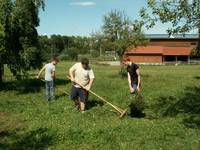 Eine Gruppe der Jugendlichen konnte unter Anleitung die Feldarbeit unserer Vorfahren kennen lernen. Neben dem Mähen mit Sense und Sichel, galt es Schafe, Ziegen, Schweine und Hühner zu füttern. Anschließend erfolgte in der Tenne einer 450 Jahre alten Scheune der Drusch von Weizengarben mittels Dreschflegel und das Trennen der Spreu vom Weizen.