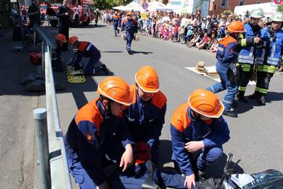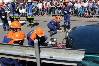 Der Sonntag begann mit dem obligatorischen Frühschoppen und bereits kurz nach 11:00 Uhr waren die besten Plätze auf dem Hof vergriffen. Erneut einen Höhepunkt des Festes stellte die Schauübung der Jugendfeuerwehr dar. Auch in diesem Jahr zeigten die Jugendlichen ihr ganzes Können; dieses Mal beim Retten eines verunfallten Radfahrers. Nach der Übung konnten interessierte Besucher am Brandschutzcontainer den richtigen Umgang mit Feuerlöschern üben und auch die Gefahren, die im Haushalt lauern (z.B. die Explosion einer Spraydose oder eine Fettbrandexplosion) wurden demonstriert. Ebenfalls auf großes Interesse stießen wiederum die Rundfahrten mit den Feuerwehrfahrzeugen für die jüngeren Besucher.