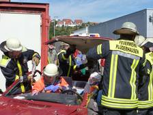 Die Übungsannahme war ein Unfall mit zwei beteiligten PKW`s und verletzten Personen. Eine Person konnte sich selbst aus dem Fahrzeug befreien, eine zweite Person war mit schweren Verletzungen im Fahrzeug eingeklemmt.