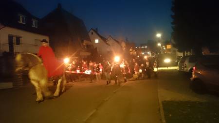 Die Mitglieder der Jugendfeuerwehr begleiteten als Fackelträger den Umzug. Nach einem Rundweg durch das nächtliche Plüderhausen endete der Zug vor den Stufen der Herz-Jesu-Kirche. Dort folgte die Darstellung der Mantelteilung des Schutzheiligen Sankt Martin und es wurden symbolisch die Martinsbrötchen geteilt.